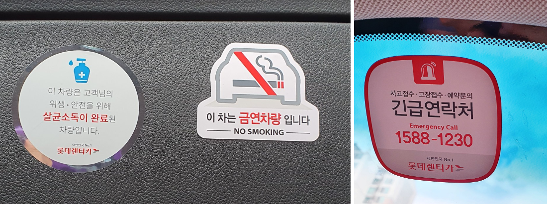 개인적으로는 렌트카이기에 사고/고장 발생 시 접수에 대한 대처법을 사전에 파악하려고 했는데, 정면 유리에 긴급연락처(1588-1230)가 매우 큰 글씨로 표시되어 있어서 좋았다.