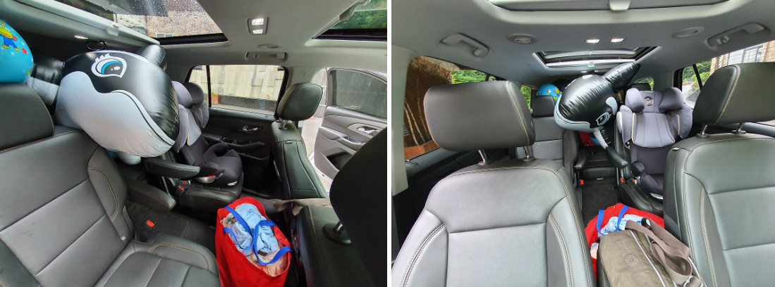 3열에 카시트 1개를 설치하고 전고를 확인하니, 아이가 전혀 불편하지 않은 공간이 확보되고 3열 시트 폴딩 없이도 꽤 넓은 트렁크 공간이 확보할 수 있음에 여행 준비하면서 가장 큰 고민거리는 해결된 걸 알 수 있었다.