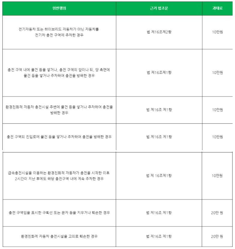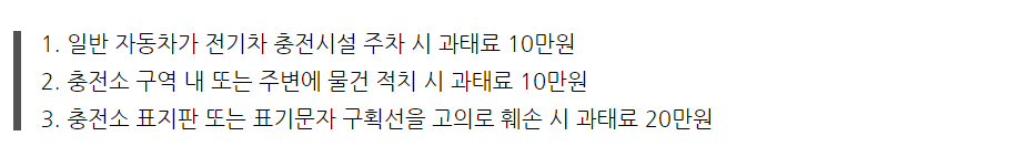 생각보다 과태료 금액이 큽니다. 알든 모르든 실수로 주차를 하면 최소 10만원의 과태료가 부과되니 충전기 앞에는 절대 주차를 하지 말아야 할 거 같습니다.