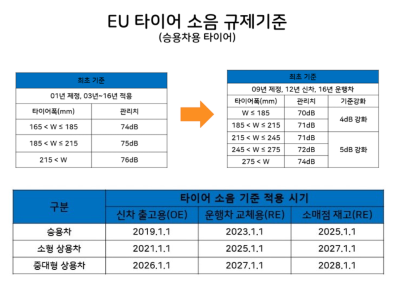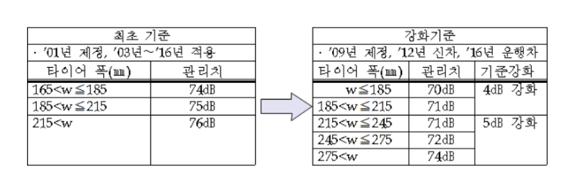 현재 타이어 소음제도의 규정은 최초 도입한 유럽연합 기준으로 정하고 있는데, 타이어 폭에 따른 규정을 기존 74~76dB에서 4~5dB정도 낮은 기준으로 강화하여 소음 발생을 줄이도록 했다.
