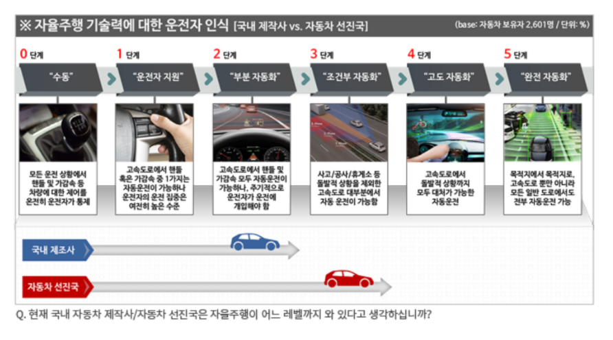 전체 응답자 중 80% 이상이 고속도로 주행시 자율주행을 활용한다고 응답하여, 자동운전에 대한 거부감은 크지 않은 것으로 보인다. 그러나 국내 제작사의 자율주행 기술에 대한 평가는 높지 않다. 자동차 선진국은 레벨3, 국내 제작사는 레벨 2로 1레벨 수준에서 낮게 보고 있다.