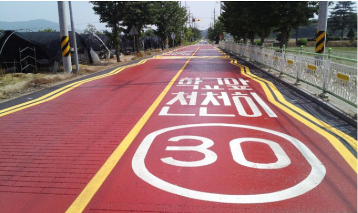 이 지역은 운전자들의 주의를 높이기 위해 노면은이 붉은 색으로 칠해져 있으며, 신호기/안전표시판/과속방지턱 등의 안전장치를 설치하고 있다.