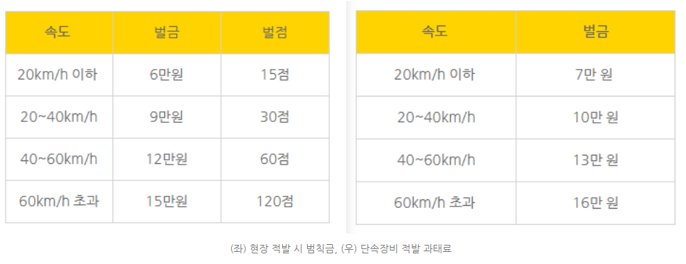 또한, 법적으로 어린이 교통사고를 예방하기 위해 2011년부터 일반도로보다 높은 벌점과 범칙금(2배 인상)을 부과하고 있다. 단적인 예로 제학속도 초과범위가 20km/h이하일 경우, 벌점 15점과 6만원의 범칙금이 부과되는데, 일반도로의 경우 벌점 없이 범칙금 3만원을 내야한다.