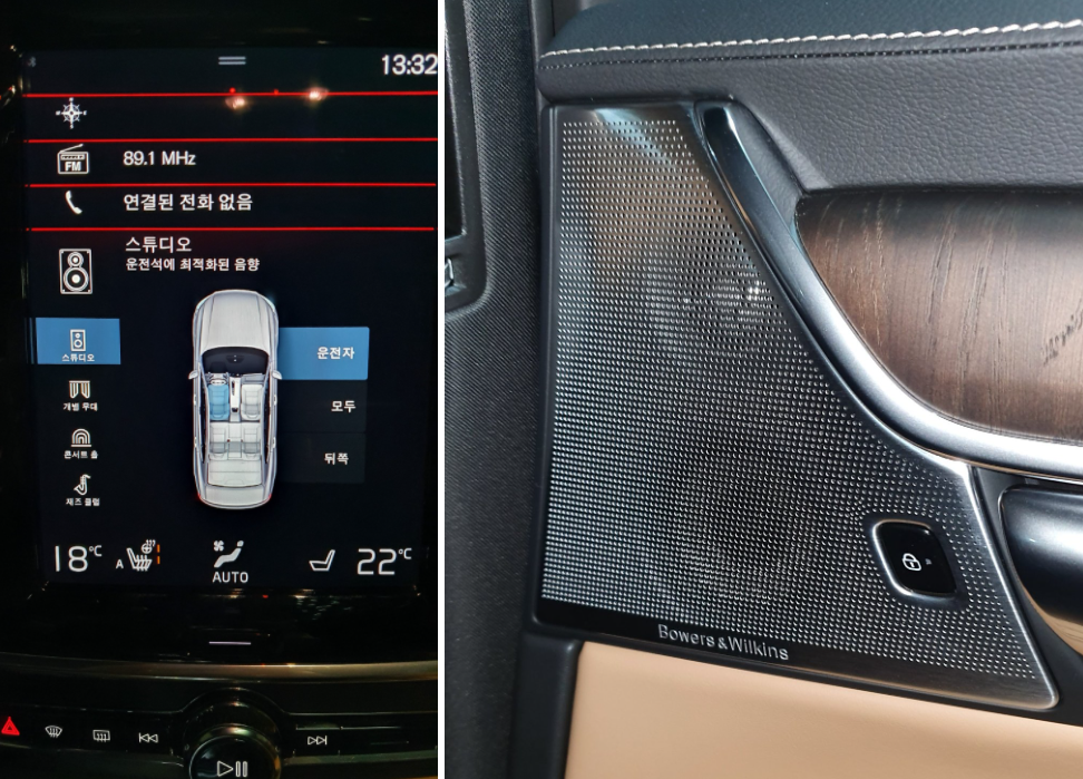 여기에 볼보 인테리어의 완성이라고 불리는 영국의 하이엔드 스피커, 바워스&윌킨스(B&W, Bowers&Wilkins) 프리미엄 오디오 사운드시스템은 안락함 그 자체이다. 여타 브랜드보다 중저음에서의 울림과 선명함의 차이가 볼보 S90을 특별한 공간으로 만든다.