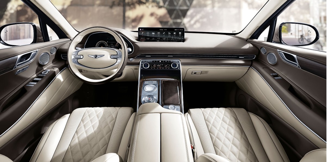 둘째, GV80 실내 디자인은 고급스럽고 깔끔한 공간구성으로 대형 SUV의 품격을 극대화했다.우아한 모습의 운전대(스티어링 휠, Steering Wheel)는 깔끔하고 정돈된 형태로 수평적인 공간감을 극대화하고 고속 주행이나 회전 시에도 운전자가 편안하게 조작할 수 있도록 사용자 중심으로 디자인됐다.