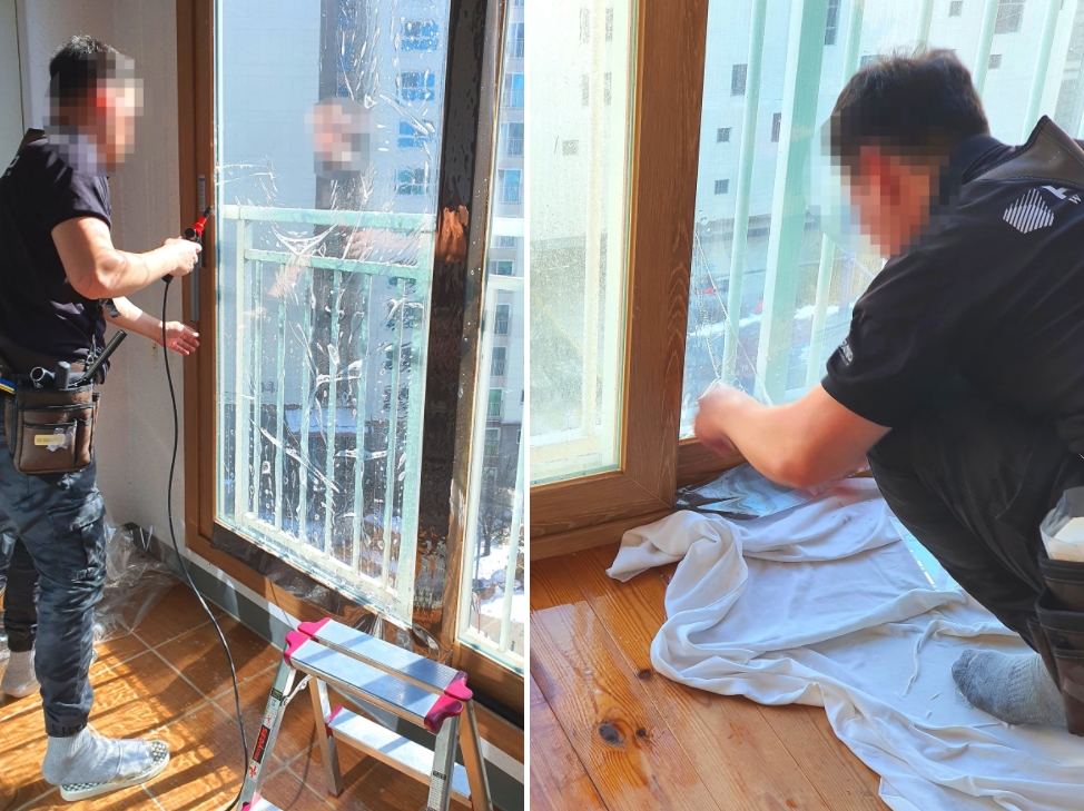 시공시간은 다른 집의 거실창과 창문의 크기가 커 조금 더 힘들 수 있다고 하였고, 방 4칸과 거실 유리창, 주방창까지 총 6군데를 시공하게 되어 약 5시간 정도의 시간이 소요됐다.