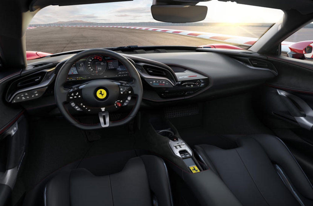 전기모터는 후륜이 아니라 전륜으로 구동되어서, FF 같은 그랜드투어 계열이 아니라 미드십 슈퍼카로는 처음 AWD 구동이 되는 설계를 갖췄다. 후진기어가 프론트 모터에 의해서 작동하기 때문에 필요하지 않은 부품을 줄이며 페라리의 기존 7단 듀얼 클러치 변속기보다 약 10kg 정도 가볍다. 이를 통해 새롭게 장착된 8단 듀얼 클러치 변속기로 같은 엔진의 488 피스타보다 0.1초 빠르다.