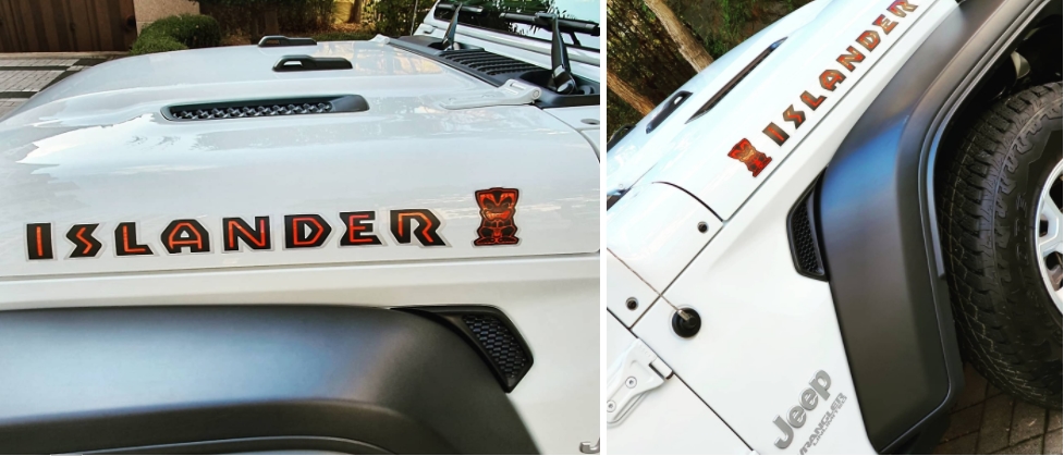 외관 디자인에는 랭글러 아일랜더 에디션다운 포인트들이 곳곳에 담겨져 있다. 보닛 옆쪽에는 아일랜더 문구와 ‘티키 밥(TIki Bob)’ 후드 데칼, 티키 밥이 크게 새겨진 스페어 타이어 커버, 17인치 실버 알루미늄 휠 등으로 에디션 모델만의 특별한 개성을 담아냈다.