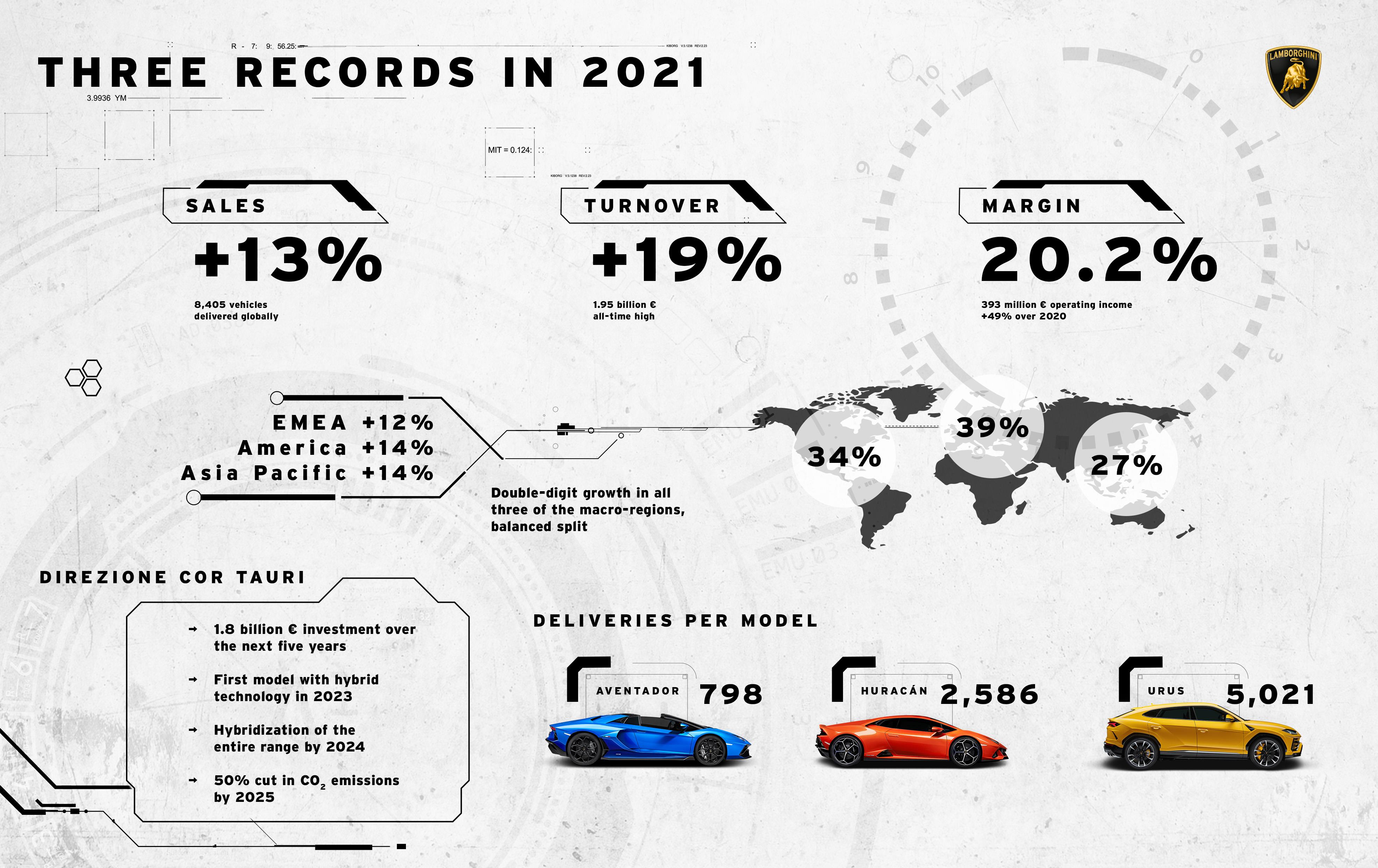 2021년은 판매량과 인도량 면에서도 오토모빌리 람보르기니에게 역대 가장 높은 성과를 이룩한 해였다. 람보르기니는 지난 한 해 동안 전 세계적으로 8,405대를 인도하며 전년 대비 13% 성장을 달성했다. 람보르기니 판매의 3개 거점 지역인 미주지역과 EMEA(유럽, 중동, 아프리카) 지역 및 아시아 태평양 지역 시장의 판매량은 균형 있게 분포되어 있다.