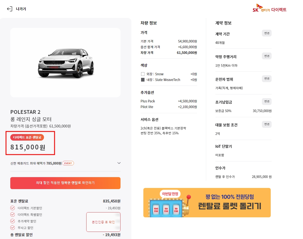 실제로 폴스타2를 SK렌터카 다이렉트로 견적부터 구매하는 방법을 이용해보니, 어떻게 이렇게 빠르게 처리가 가능한 지 놀라움 뿐이다.