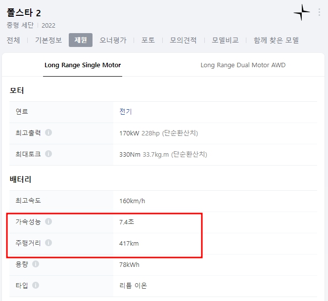 먼저, 폴스타는 1회 충전시 334~417km의 주행거리를 보이고 복합연비는 복합 3.8~4.8km/kWh(도심 4~5.1, 고속 3.6~4.5)를 보인다. 배터리 용량은 78kWh이고 출력은 170~300kW를 보여 전기차 중에서도 퍼포먼스가 좋은 모델이다.