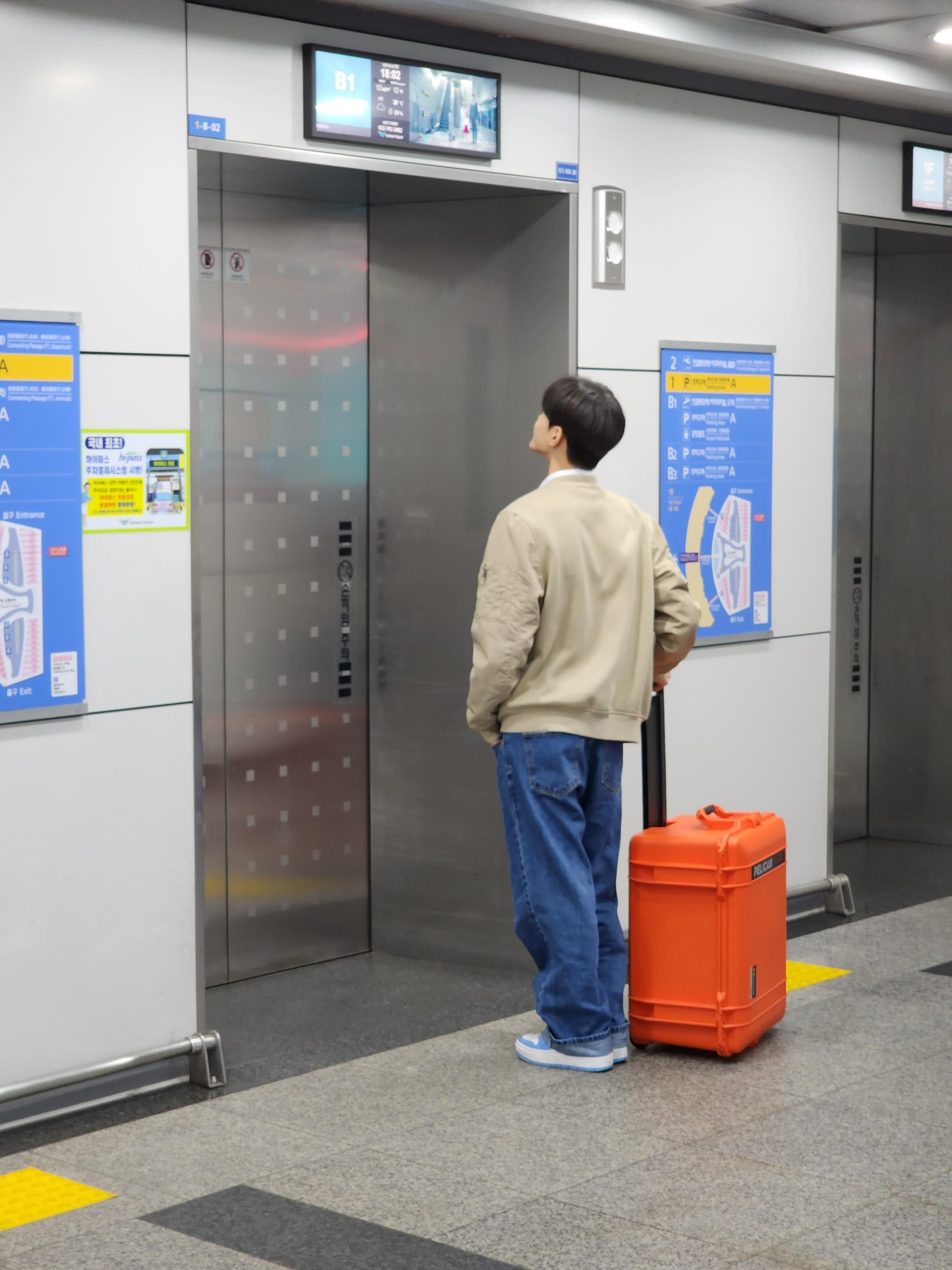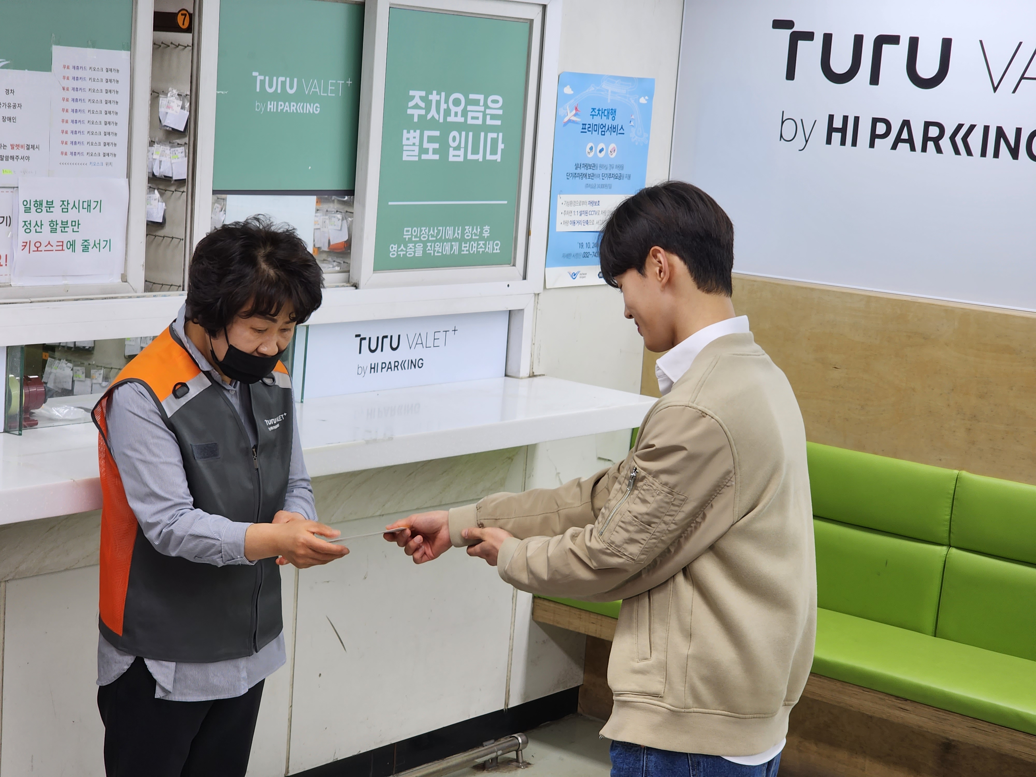 국내선 청사 2층에 위치한 주황색 복장의 공식주차대행 서비스 브랜드 복장을 입은 직원들이 응대를 합니다.