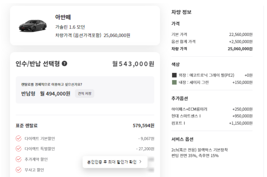SK렌터카 다이렉트 홈페이지에 들어가면 실시간 재고확인이 가능하다. 실시간 재고에 올라와 있는 모델의 옵션을 확인하고 원하는 모델을 선택한 뒤 보험범위와 계약 조건을 정하면 계약 가능한 견적을 바로 확인할 수 있다.