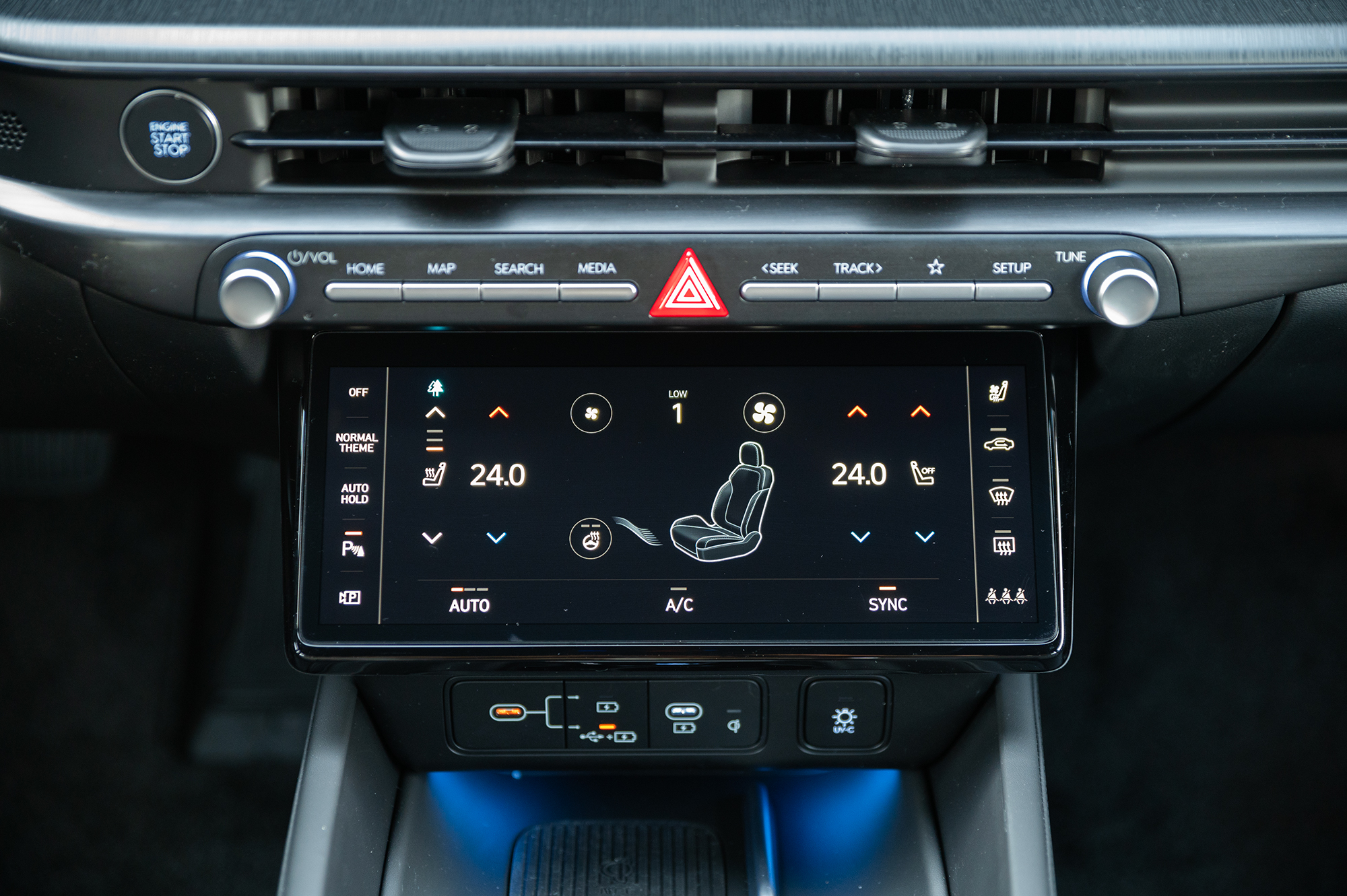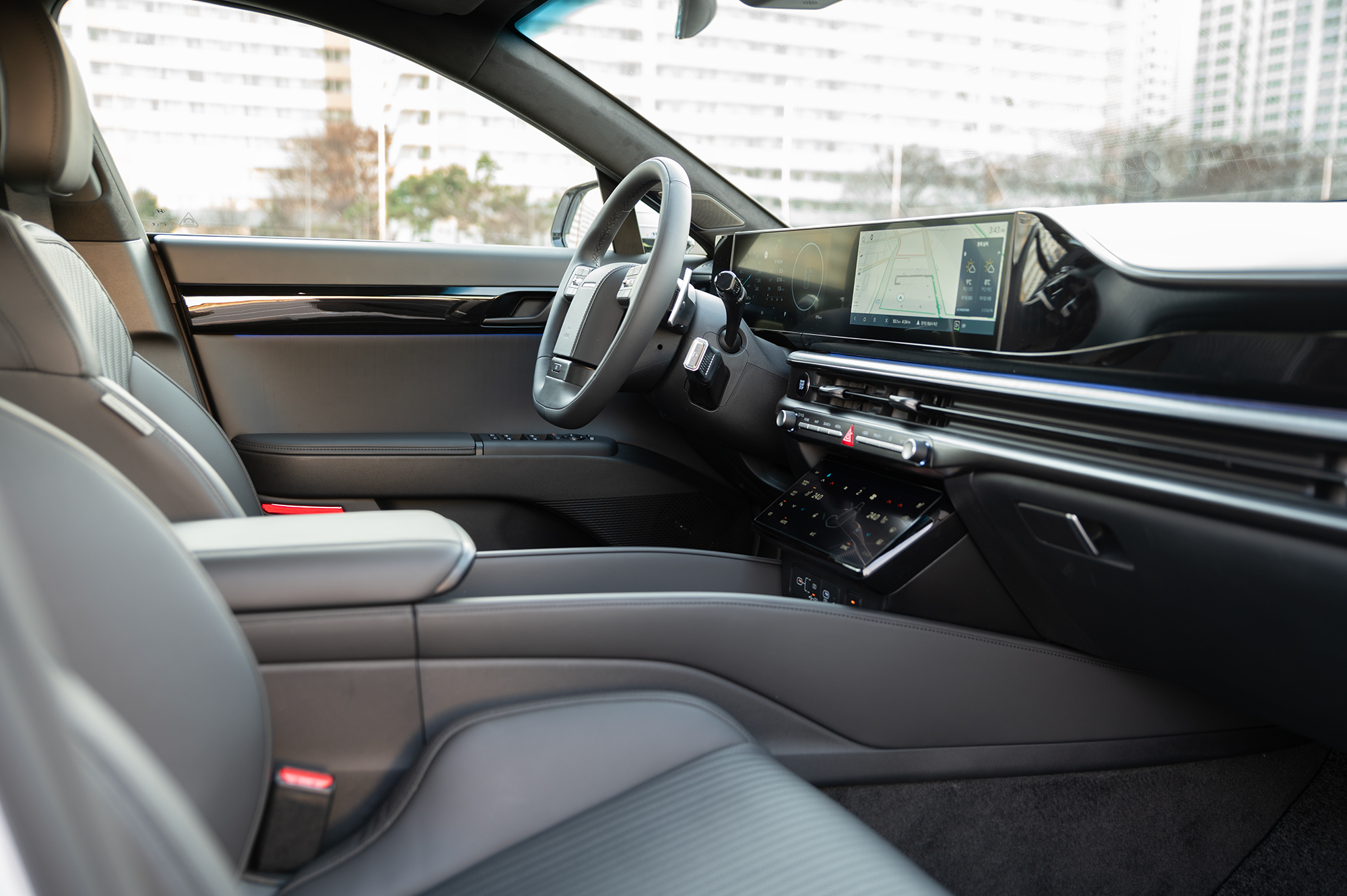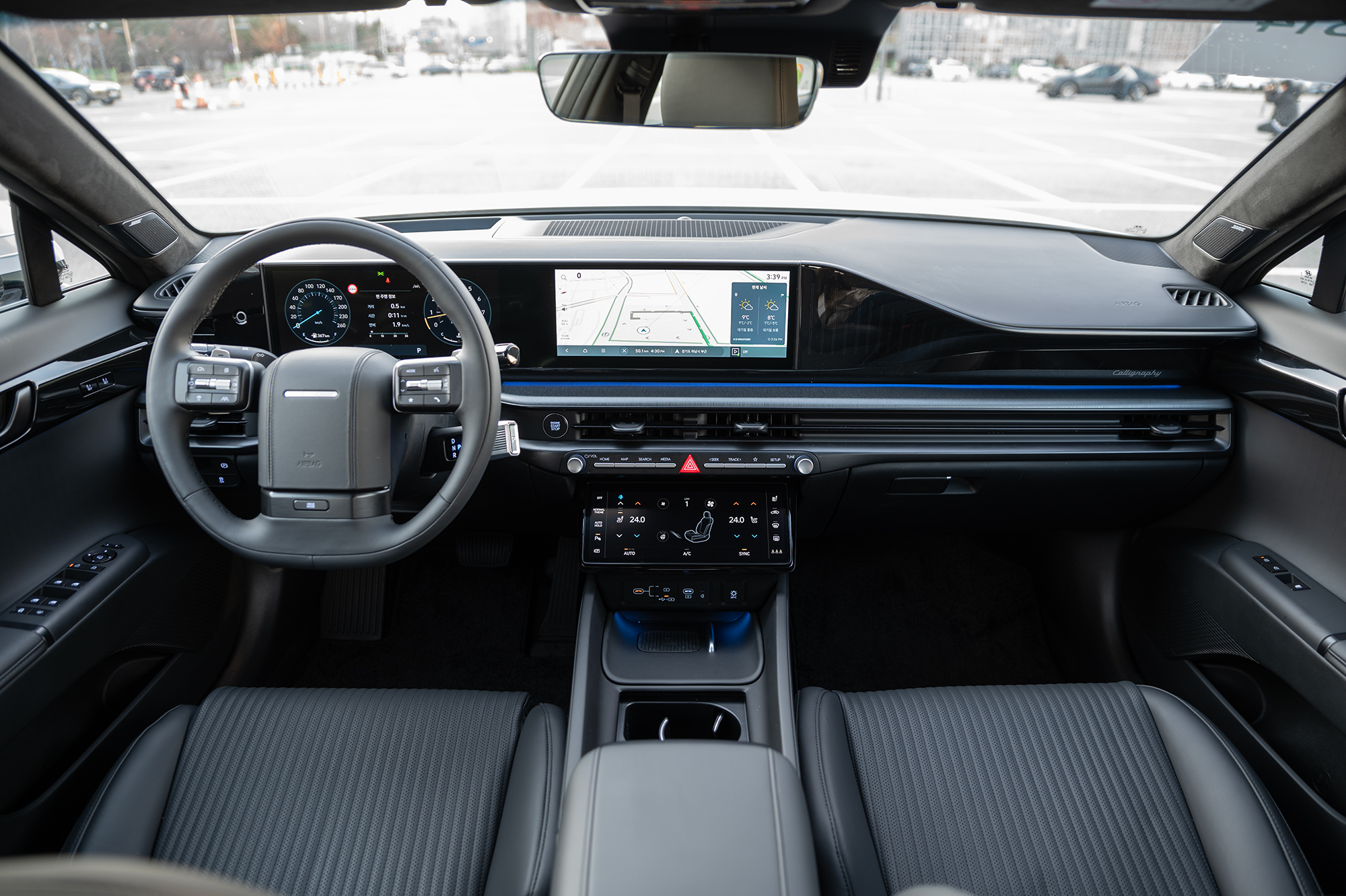 실내 전면의 12.3인치 대화면 클러스터와 내비게이션을 일체형으로 통합한 디스플레이는 중앙 하단에 위치한 풀터치 10.25인치 대화면 통합 공조 콘트롤러와 조화를 이루며 하이테크한 이미지를 뽐낸다.