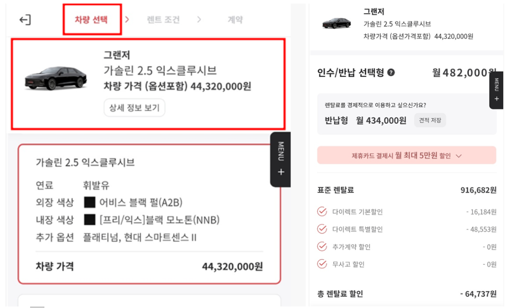 이렇게 확인한 렌탈료에는 복잡한 자동차 취등록세, 보험료, 자동차 정비 및 수리 등의 유지보수비가 다 포함되어 스트레스 없이 월 렌탈료만 내고 신형 그랜저를 내 차로 마련 가능하다.