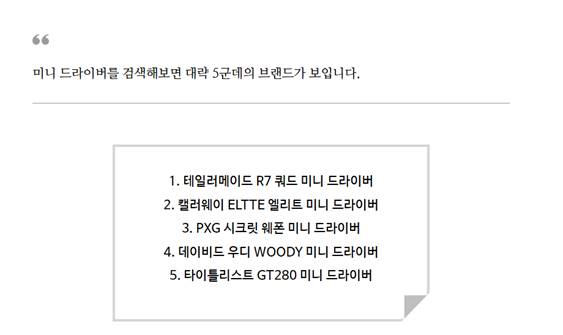 그렇다면 어떤 미니 드라이버가 좋을까요? 아직 미니 드라이버도 생소하신 분들도 있을 거 같아서 이제 내 마음대로 경험을 바탕으로 순위를 매겨본 미니 드라이버를 정리해보려고 합니다. 개인적인 의견이니 반박보다는 그냥 재미있게 봐주세요.!(꾸벅)