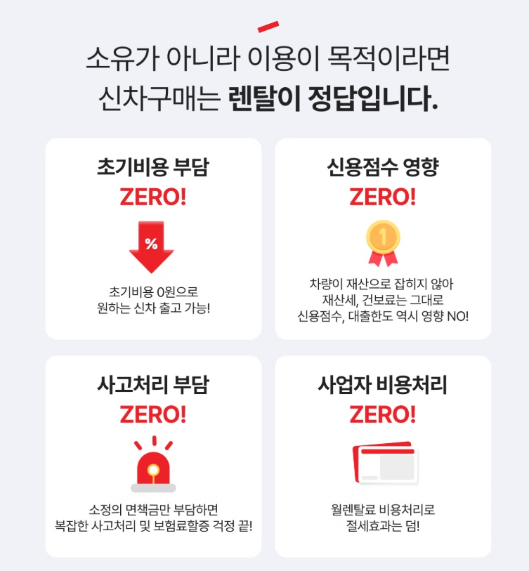 - 초기 비용 부담이 적고, 사고 처리나 보험료 걱정 없이 차량을 이용할 수 있어요.